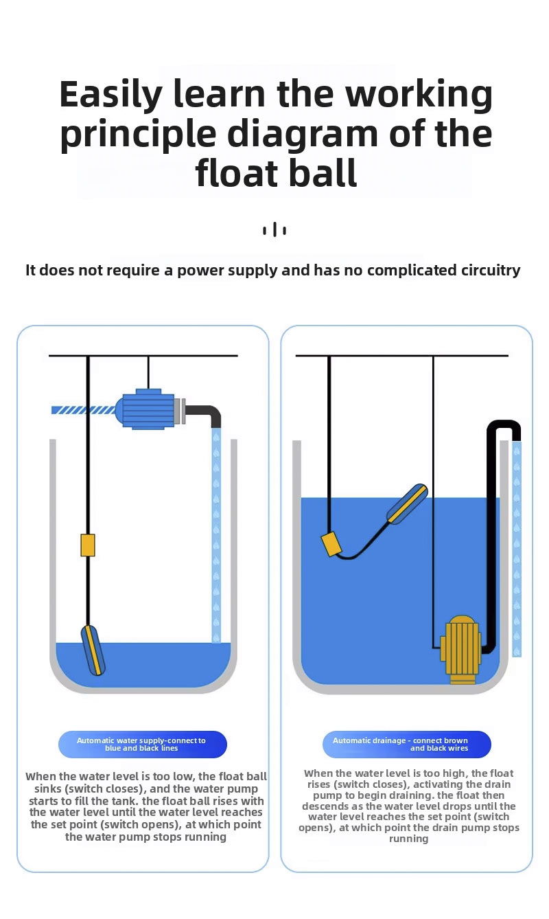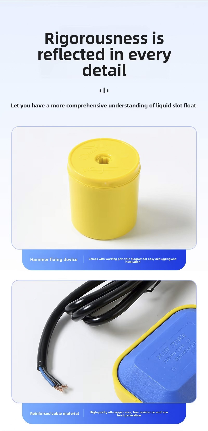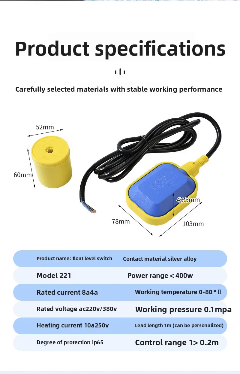 इस फ्लोट स्विच में 2m, 3m, 5m, 10m, IP68 सुरक्षा ग्रेड के साथ एक बड़ा गोलाकार डिज़ाइन है, और यह 0℃ से 80℃ तक के तापमान पर संचालित होता है, यह 110V से 220V की विस्तृत वोल्टेज रेंज का समर्थन करता है और इसमें ±0.5Mpa का मजबूत कामकाजी दबाव होता है। उत्पाद लेजर उत्कीर्णन, उभरा हुआ लोगो या OEM/ODM के साथ अनुकूलन योग्य है। सेवाएँ, विविध अनुप्रयोगों के लिए अनुकूलनशीलता सुनिश्चित करना।