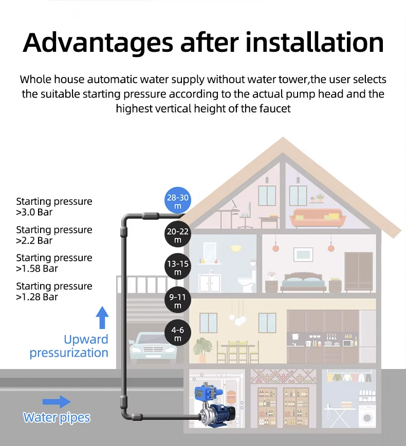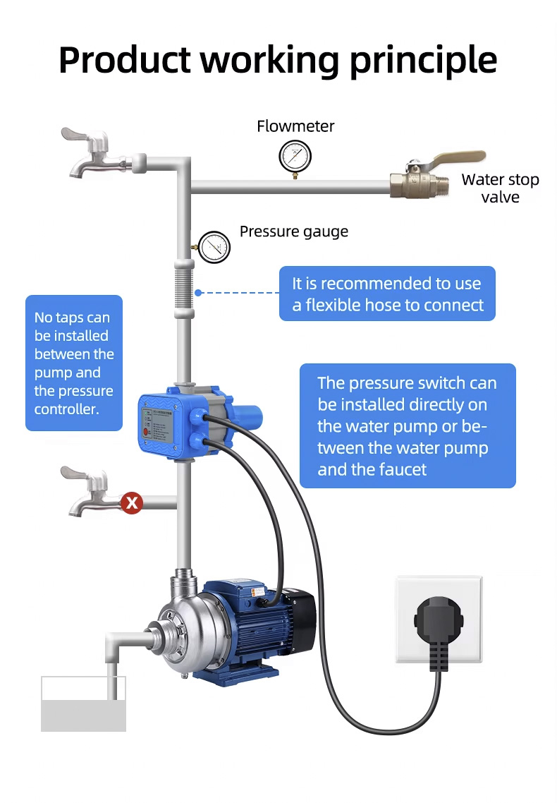 स्वचालित पंप नियंत्रक जल पंप इलेक्ट्रॉनिक दबाव नियंत्रक स्वचालित जल पंप की जटिल स्थापनाओं को प्रतिस्थापित कर सकता है। इसमें स्थिर प्रदर्शन, कम रखरखाव और लंबी उम्र की विशेषताएं हैं।